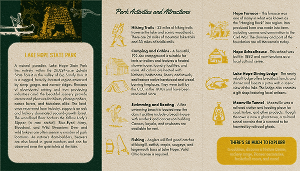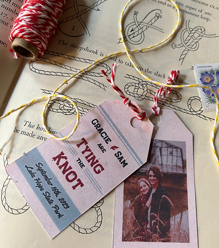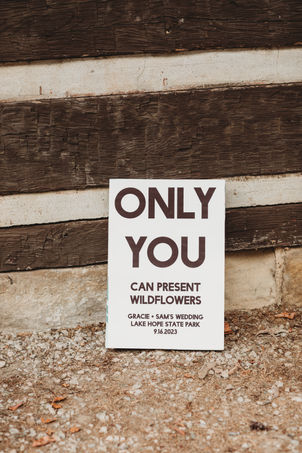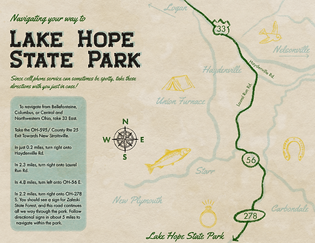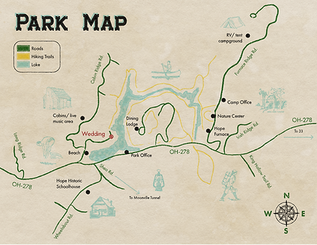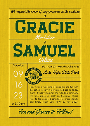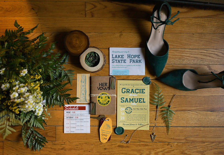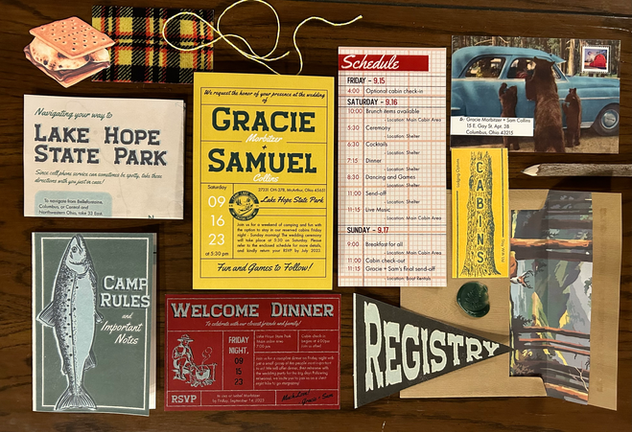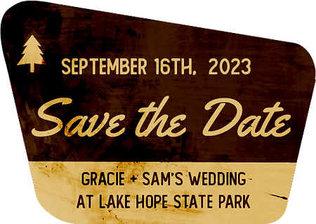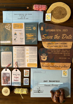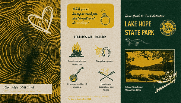 Based on the iconic National and State Park sign shapes, I designed our save-the-date to be eye catching and fun. I included a smaller piece that could be stuck in a purse or on a refrigerator, or even given to the most forgetful family member. I also included a small pamphlet about the park we chose as our venue to get folks excited about the weekend wedding in which they could also have time on their own to explore. For this piece, I used vintage fire safety pamphlets that were still being distributed at Lake Hope's wildlife center for inspiration.