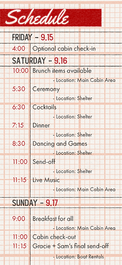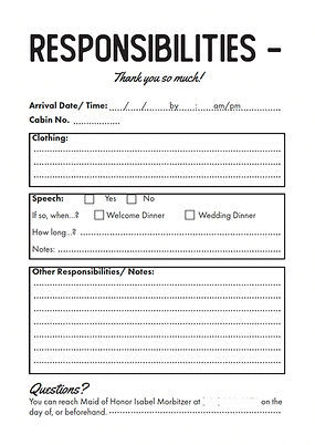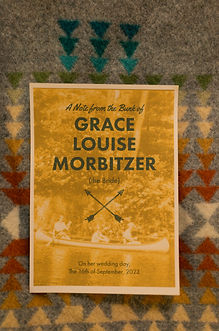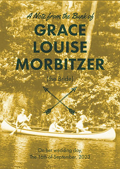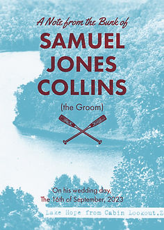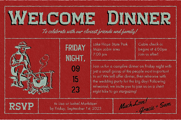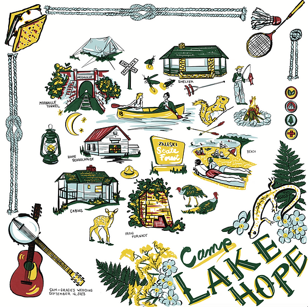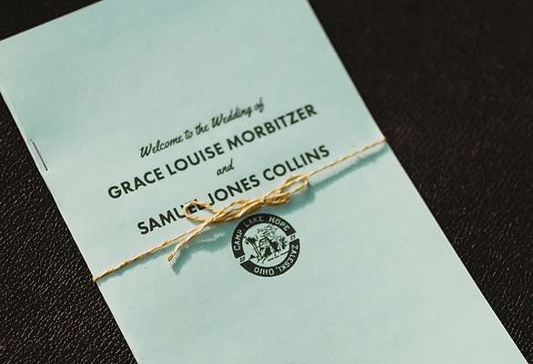 A real graphic design challenge, this had to be readable for everyone outside during the ceremony. I included photos of us camping, the names of everyone involved, and even some sheet music to make it a real camp sing-a-long!