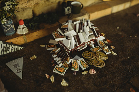 These extra papers and cards included the below items. I had the most fun creating an interior "scene" for the menu, on which I used a font with a shadow in Photoshop on the image of a vintage menu board to write out each item. I also drew out each of the maps myself, and adding a line on the RSVP cards about song requests was a great pro tip when putting together our reception playlist! Our best purchase was the envelopes that have an actual woodgrain texture from envelopes.com. I did hand-letting for the addresses, and the USPS had the prettiest woodblock wildflower stamps in almost our exact colors! We used wax seals with a fern stamp, and tied the interior bundle together with more colorful twine.