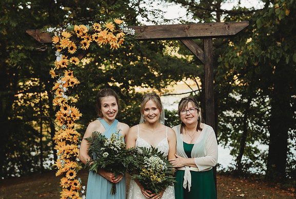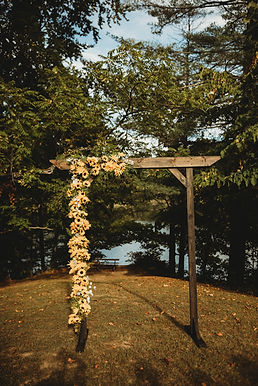 Based on the design of last century campground entryways, with the help of my dad, Sam and I built and stained a wooden arch to be the centerpiece of the wedding at the end of the aisle. I stapled faux flowers up and down one side.