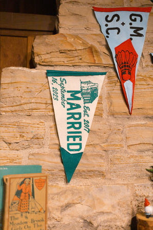 My favorite piece was a large felt banner hung in the space above our shelterhouse dance floor featuring a quote from our song, "Two of us on the Run" by Lucius. I cut each letter out by hand and sewed it all together, embroidering the lower designs. We still have it hanging in our home today!
