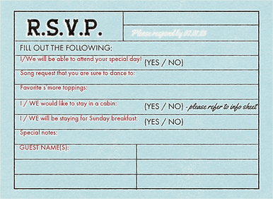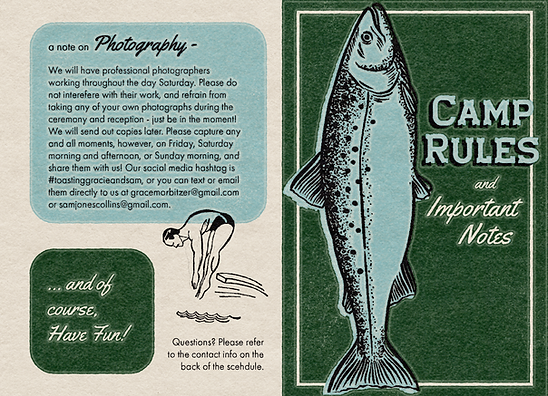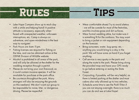 We had heard from a few less-adventurous friends that they were unsure or concerned about the idea of camping, so in our formal invitation set, we included this booklet to give them more information. We also wanted to make sure all of our guests were courteous to park staff and facilities. These pieces were again created in Adobe programs and run through the "Atomica" action. (pages out of order to accommodate booklet printing)