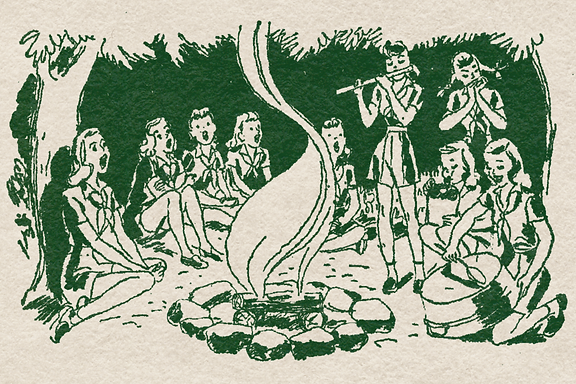 This pamphlet was made in Adobe Photoshop and InDesign and rendered in True Grit Texture Supply's "Atomica" program. The colors of forest green, sunflower yellow, basic red, and a light, almost neutral blue were chosen for our theme based on my research of vintage camp ephemera and photos.