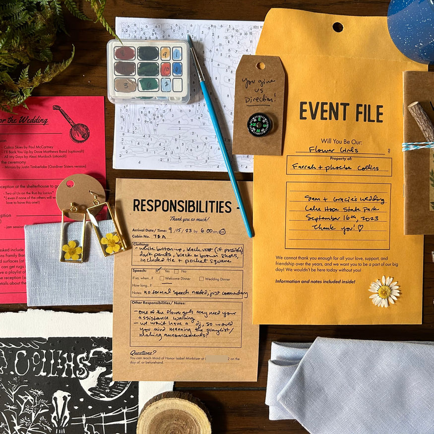 To ask our friends and family members to be part of our wedding party, we gave them official envelopes containing everything they might need to know, as well as some fun items like a block print I created, a paint-by-numbers, and a linen tie or pressed flower resin earrings. We included small notebooks (designed to resemble the iconic Field Notes) with tree branch pencils, and tiny compasses on the back with tags reading "You give us Direction!" We gave these out as well to some of Sam's family members who would be our musicians, hence the theme of the print.