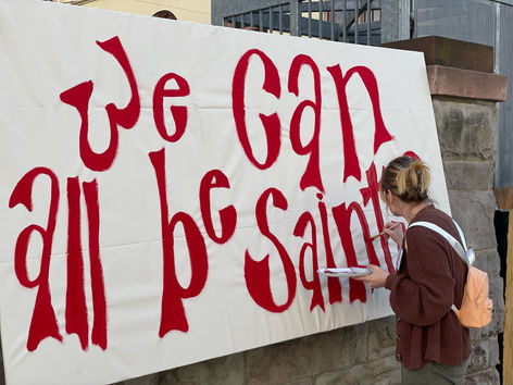 In these photos, you can see the mural I was commissioned to do being used in their branding for the event, and the piece itself featured inside the church it was held in front of. On the panels outside, I guided forum attendees in creating a portrait of themselves with a halo to help them realize we can all be saints! It was also powerful to see all the faces of the community together on these canvases, and for them to feel that they are a part of something. I prepped these boards by stenciling face shapes and haloes in different colors, and they were able to access paints on small tables throughout the area. Community members stopping by the organization for the services they rely on, or people who were simply walking through (including a class of school students) were able to add their faces as well! It was incredible to see how differently they all turned out and what folks chose to include, and the conversations I had with participants about the activity and their ideas about community and sainthood were so fascinating.