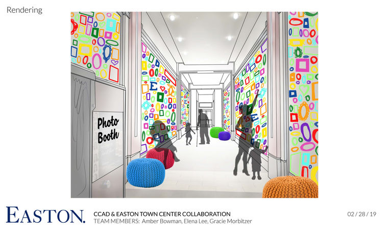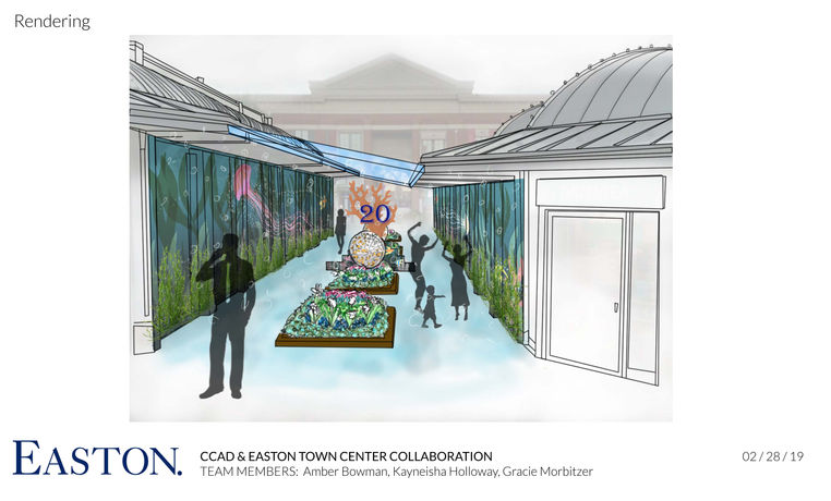 Easton Town Center, located in Columbus, Ohio, wanted a way to install a display or interactive area of some sort that would be for the celebration of their 20th birthday, would give patrons a spot to take pictures, and make the "less-loved" areas more exciting. They wanted an idea that they could pursue as either a permanent or temporary change to their buildings or empty spaces. Easton gave the class a tour of their grounds and pointed out spots that they wanted us to focus on. From all the locations, we each decided to pick 3 of the locations and brainstorm our own ideas.