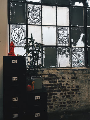 In the studio, I have also added window paint to be reminiscent of stained glass, furniture made of more industrial textures and colors, and benches set up like pews to face the wall of icons and red votive candles (much like a Catholic church).